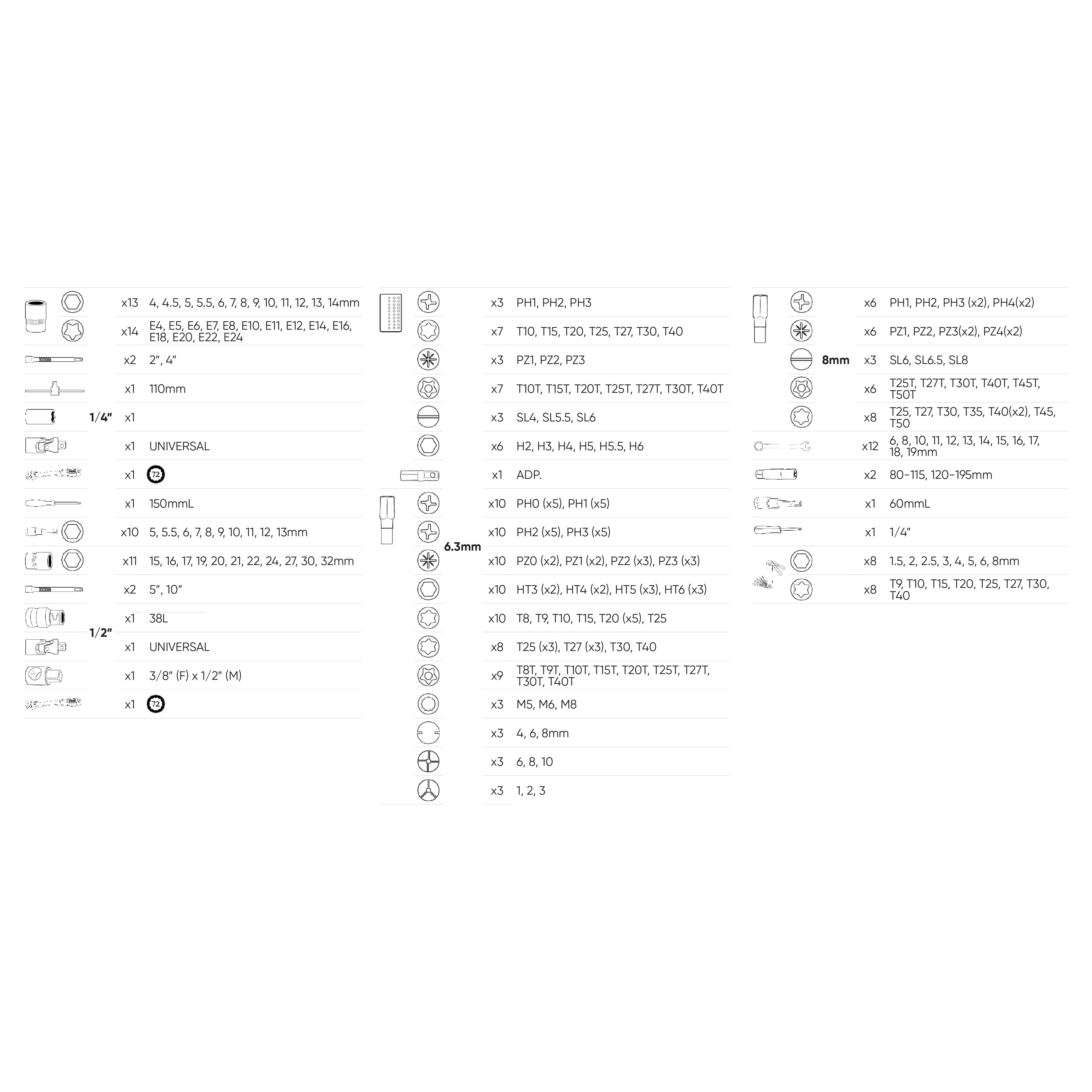 Torx (T): T8, T9, T10, T15, T20×5, T25